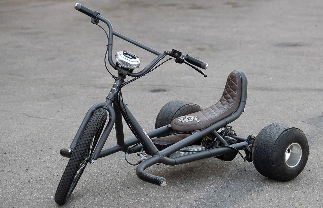 - Трицикл для дрифтинга Big Wheel Drift Trike. Эти модели пользуются успехом в дрифтинге. Это наверно самое лучшее изобретение в области дрифтинга. Вся конструкция выполнена из самых современных элементов. Рама выполнена из легкой легированной стали. Кроме этого спереди установлен двигатель с мощность 6,5 л.с. На задних колесах установлено покрытие из ПВХ, благодаря которому, обеспечивается идеальное скольжение во время заноса. Кроме этого на передней вилке имеется удобная подставка для ног. Однако есть один недостаток, это стоимость – она очень высокая. Но он действительно этого стоит, с такими качествами и функциями;