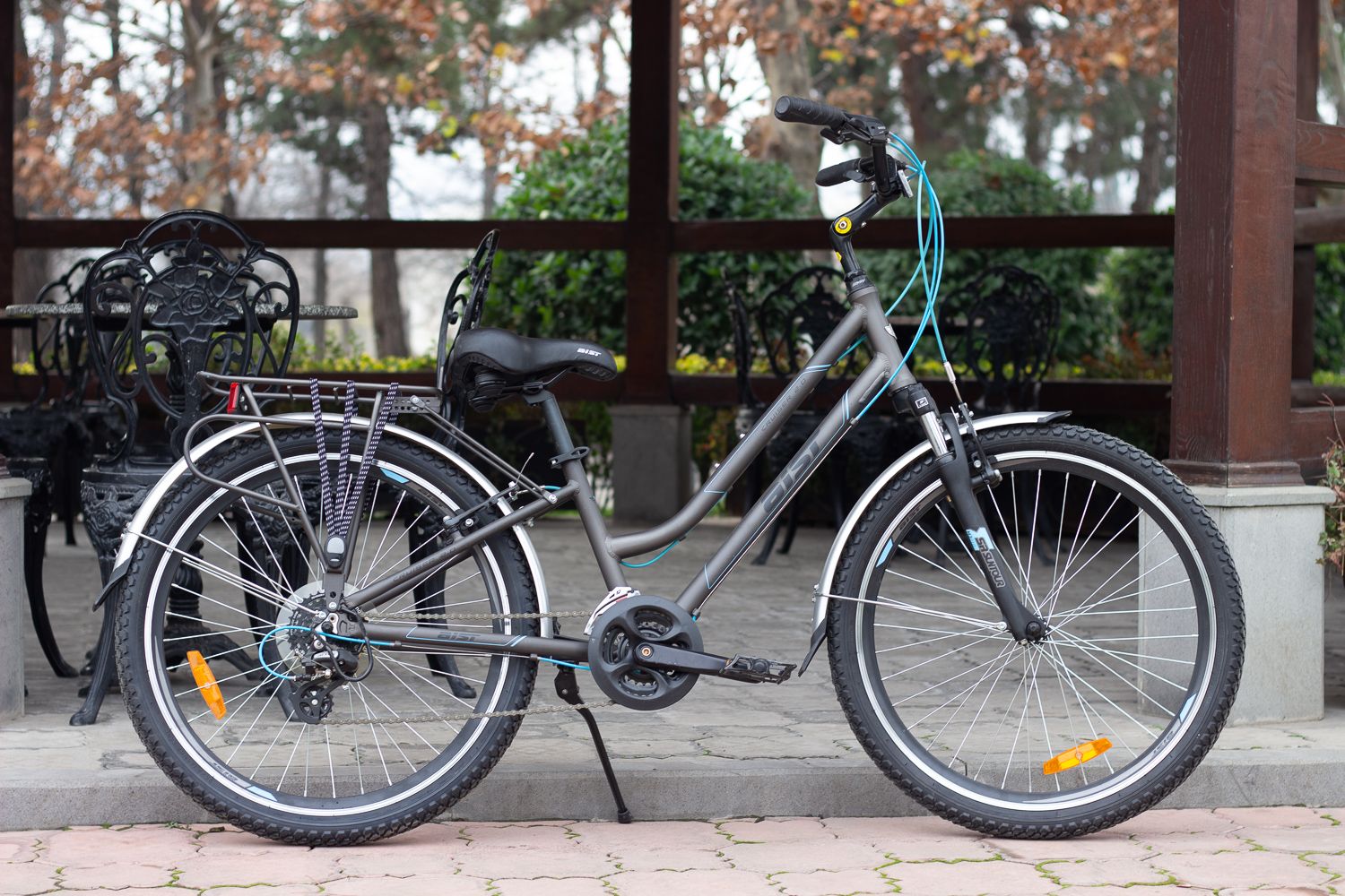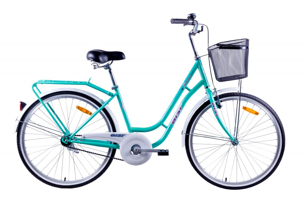 Дополнительно на велосипед установлены корзина и багажник, что соответствует женским требованиям, когда необходимо перевезти ручную кладь. Колеса защищены крыльями, а цепь имеет дополнительную защиту. Удобная подножка обеспечивает устойчивое положение транспортного средства на велопарковке.