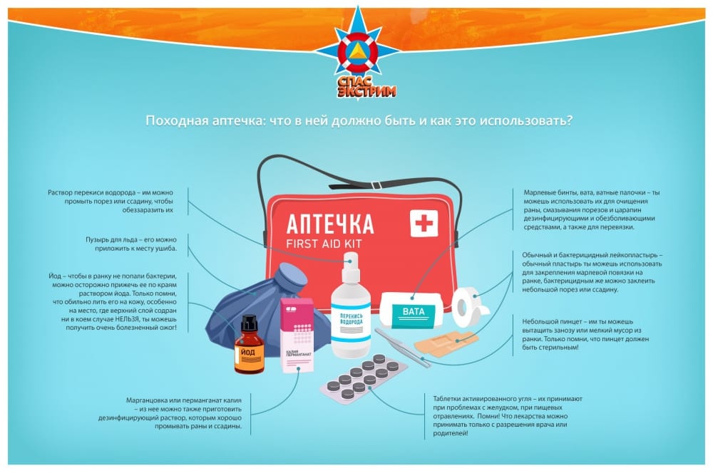 — бинт стерильный средней ширины; — вата; — йод ; — перекись водорода; — пластырь средней ширины; — пластырь бактерицидный, 5 шт; — салфетки влажные бактерицидные; — ранозаживляющая мазь левомеколь или др. — бинт эластичный.