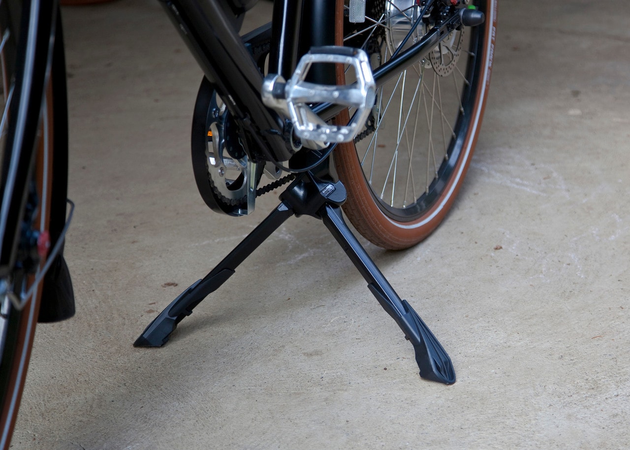Это самые лучшие модели для велосипедов, используемых в длительных походах. Они, конечно, немного тяжелее своих одноногих собратьев, но обладают одним неоспоримым преимуществом: обеспечивают самую удобную и устойчивую стоянку из всех предыдущих. Опрокинуть велосипед с такой подножкой гораздо сложнее, чем байк на боковой подножке.