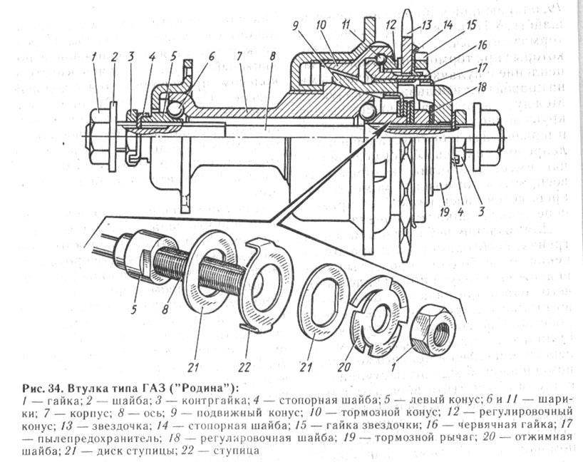 1 — гайка; 2 — шайба; 3 — контргайка; 4 — стопорная шайба; 5 — левый конус; 6,11 — шарики; 7 — корпус; 8 — ось; 9 — подвижный конус; 10 — тормозной конус; 12 — регулировочный конус; 13 — звезда; 14 — стопорная шайба; 15 — гайка звезды; 16 — червячная гайка; 17 — пыльник; 18 — регулировочная шайба; 19 — тормозной рычаг; 20 — отжимная шайба; 21 — диск ступицы; 22 — ступица.