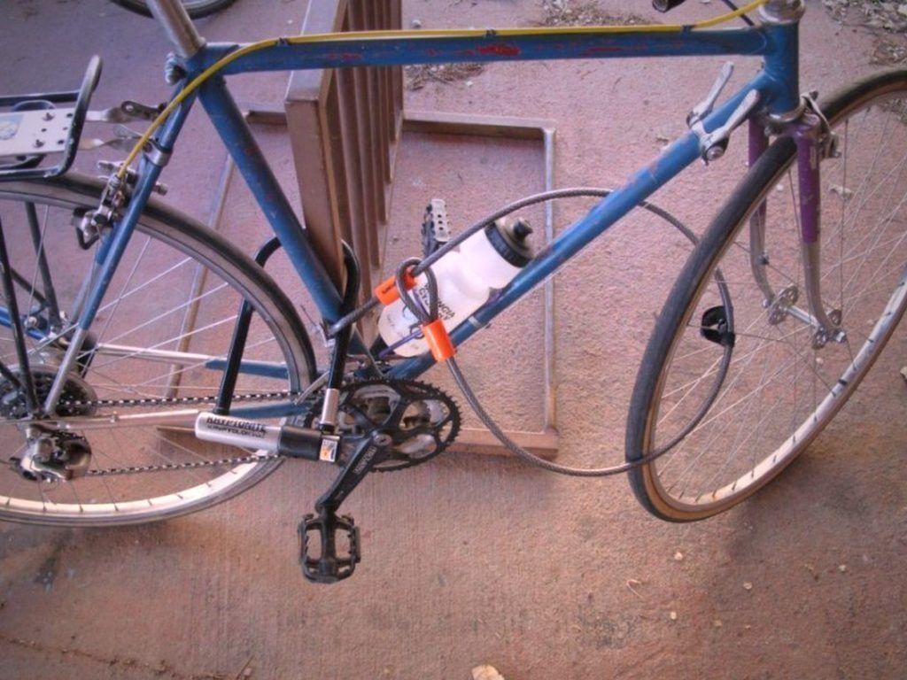 Недостаток U-образного захвата в том, что им нельзя обхватить дерево или столб, ведь организованных велостоянок у нас нет. Поэтому придётся пристёгивать велосипед за раму, желательно прихватив и заднее колесо к железному заборчику. Зацеплять лишь одни колеса глупо, так как они не являются самыми дорогими деталями велосипеда. Можно ещё сказать, что велозамок в форме U очень громоздкий, и его сложно перевозить на велике. Но как можно видеть на следующей фотографии, это не является проблемой для смекалистого велосипедиста.