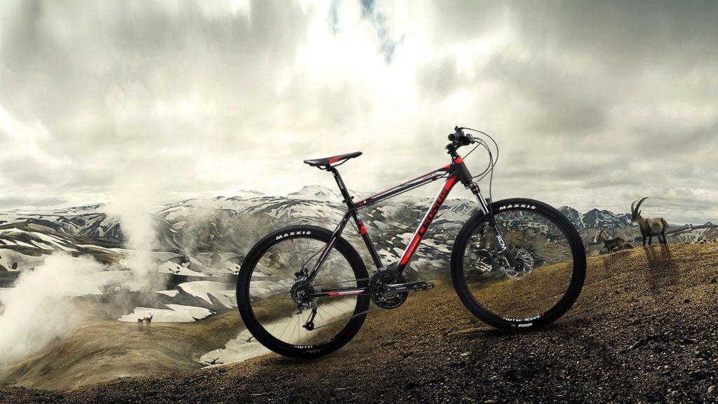 «База» для горного велосипеда. Достаточно простой велосипед с двумя переключателями скоростей, прямым рулём на небольшом выносе, с передним амортизатором и достаточно агрессивным протектором на колёсах диаметром 26 дюймов. Есть множество вариантов, которые относятся к конструктивным особенностям. Перечисление их будет слишком долгим.