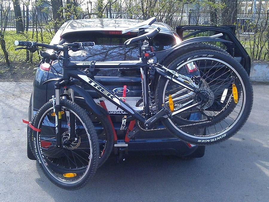 Автокрепление на заднюю дверь – отличная альтернатива размещению байков на крыше. Представляет собой кронштейн, который устанавливается на дверь багажника. В зависимости от модели, на него можно подвесить 1-3 велосипеда. Цена начинается от 4000-4500 рублей. Логично, что может устанавливаться только на на те машины, на которых есть дверь подходящей формы. Внедорожники, универсалы и минивены ликуют, седаны грустно стоят в сторонке.